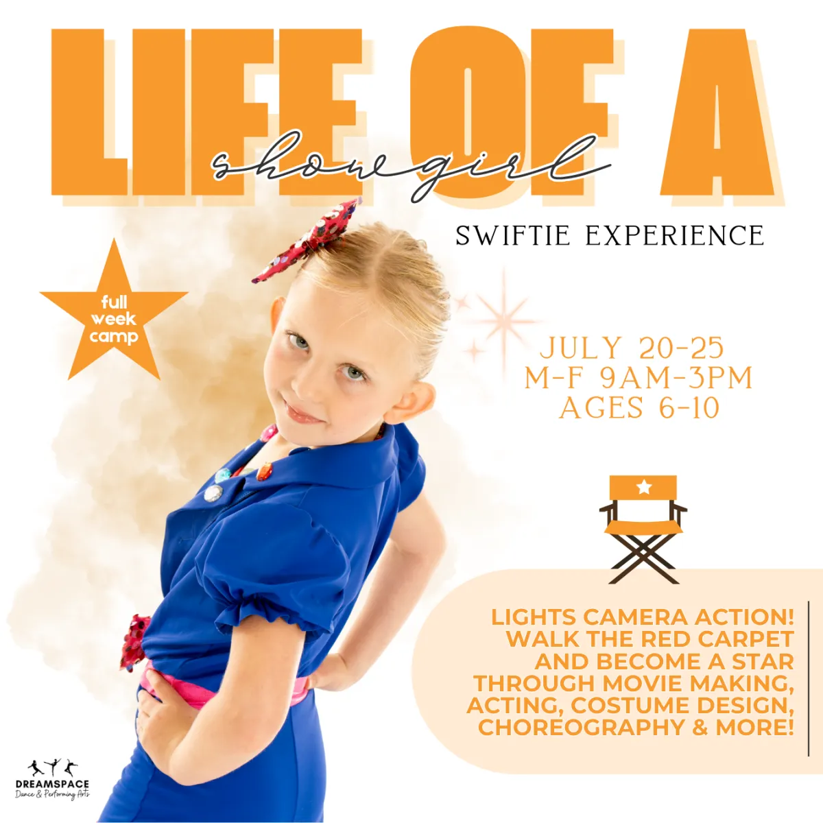 Each day includes themed dance classes, performance games, creative activities, and Swiftie-inspired crafts... think friendship bracelets and lots of sparkle. The week wraps up with a show-stopping mini performance where dancers get to take the stage and share their sparkle. It’s the ultimate camp experience for Swifties who love to dance, perform, and dream big!