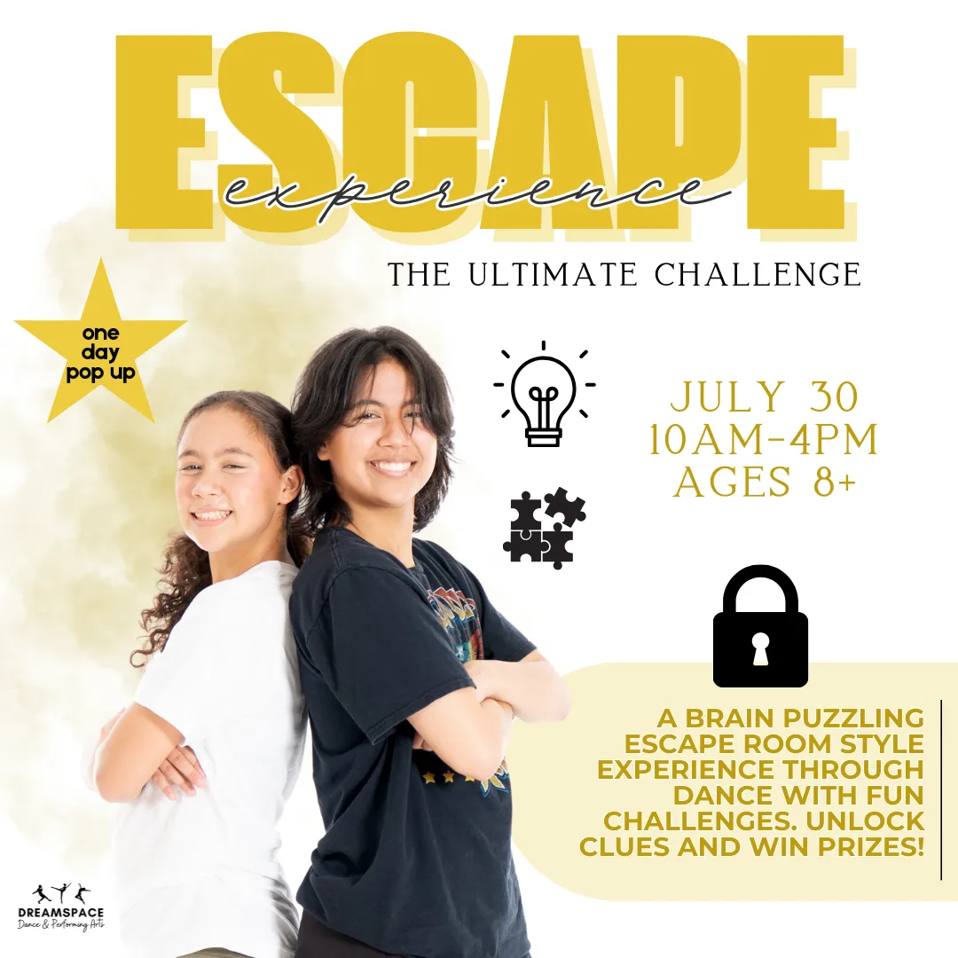 Think fast, move sharp, and dance your way to victory at The Escape Experience! This one day pop up camp blends high energy dance with brain teasing escape room style challenges for an unforgettable adventure. Dancers will work in teams to solve puzzles, unlock clues, and complete movement based missions all while learning choreography inspired by hip hop, acro and contemporary styles.