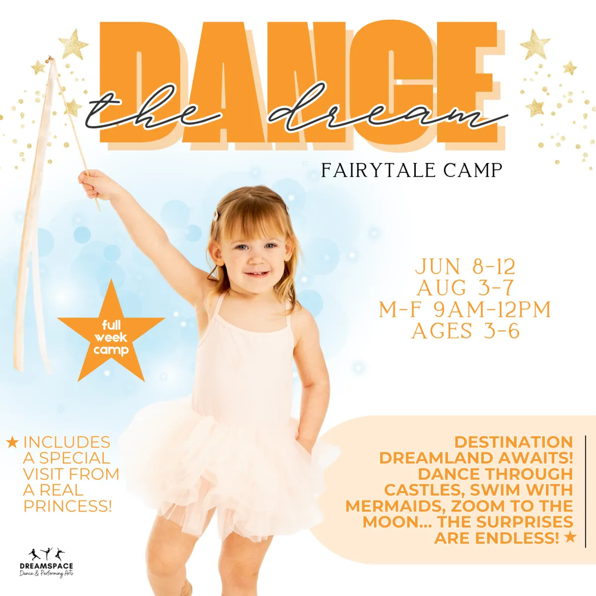Next stop… Destination Dreamland! In our signature 3 hour Dance The Dream Camp, we will experience a magical morning of music, dancing and activities. Venture through castles, swim with mermaids, walk with dinosaurs, zoom to the moon… the surprises are endless! Each day also includes a snack + story break, themed arts + crafts, movement games and creative adventures. Join us for a week of summer fun!