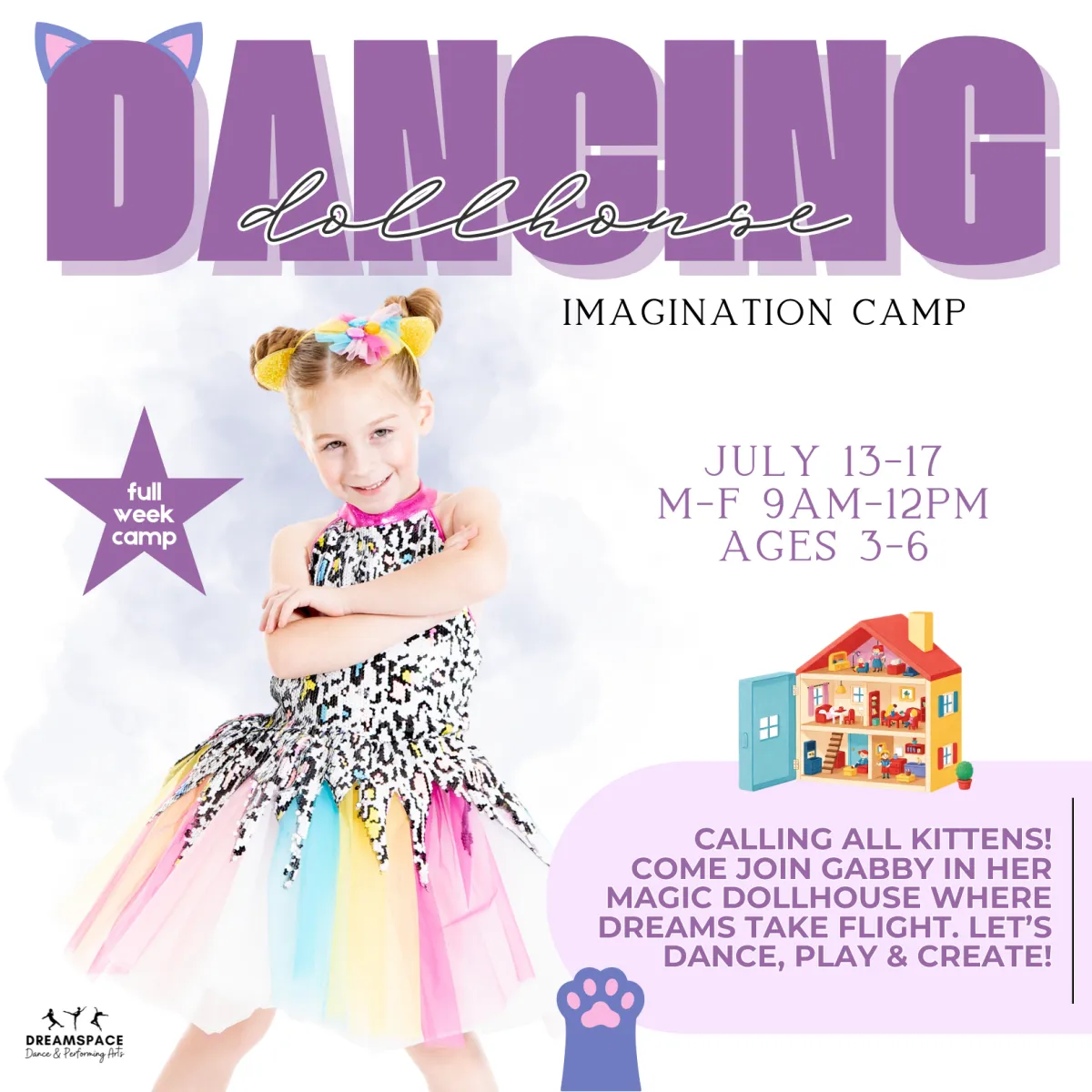 Each day is filled with dancing, music and rhythm games, imaginative movement activities, and adorable themed arts + crafts like kitty ears and dollhouse creations. Camp wraps up with a sweet end-of-week sharing day where dancers can show off their moves to mom and dad. Join us for a week full of dancing, giggles and dollhouse fun!